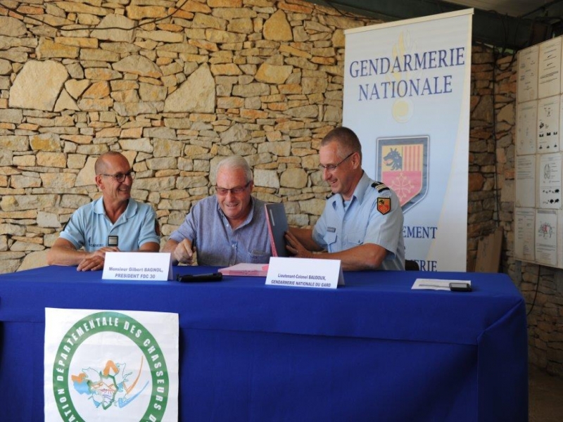 Dans le cadre de la collaboration entre la Fédération des Chasseurs du Gard et la Gendarmerie du Gard, une convention de partenariat a été signée le mardi 26 juin 2018, par le Président BAGNOL et le Lieutenant Colonel BAUDOUX.