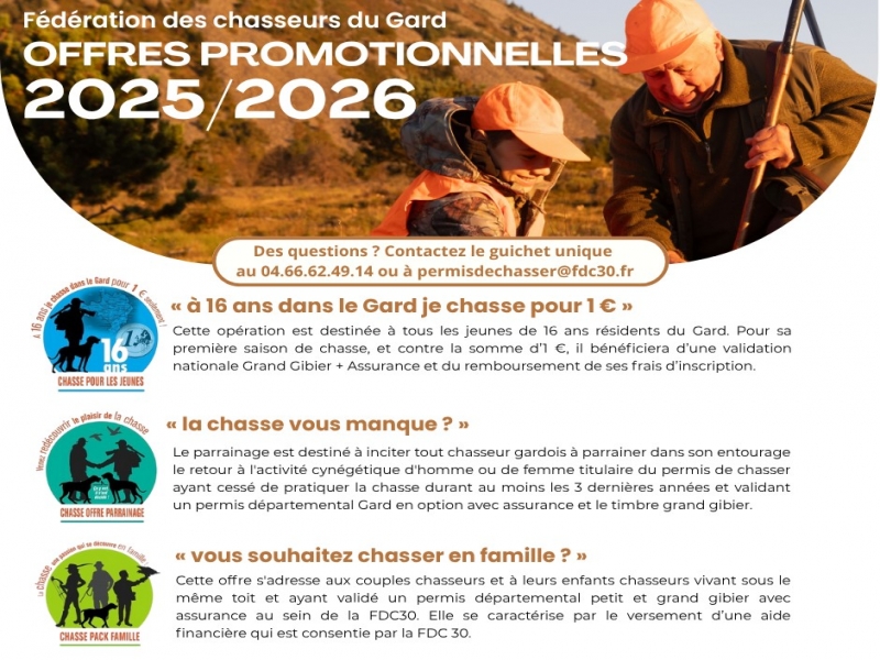 • A 16 ANS, JE CHASSE POUR 1€: Cette opération est destinée à tous les jeunes de 16 ans, résidents du Gard. Contre 1€ symbolique et une autorisation parentale, le jeune chasseur ou chasseresse, bénéficiera d'un permis national toutes espèces pour sa première saison de chasse.