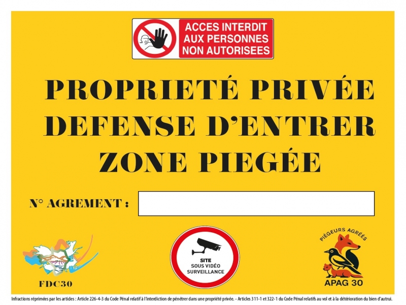 Les zones piégées doivent être signalisées de manière apparente sur les chemins et voie d’accès (Arrêté ministériel du 29 janvier 2007, Art.12).