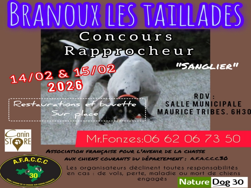 7 et 8 mars 2026 - Aigaliers CONCOURS DE MEUTES SUR SANGLIER CEZ Bertrand /06.62.26.46.70 7 et 8 mars 2026- Saint Sébastien d'Aigrefeuille CONCOURS DE CHIENS RAPPROCHEURS 06 13 41 13 04 20, 21 et 22 Mars 2026 - Sum...