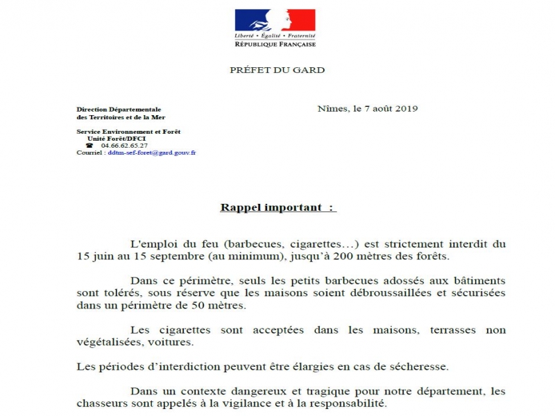 Dans le cadre du plan de prévention et de lutte contre les incendies, le Préfet du Gard rappelle aux chasseurs et aux utilisateurs de la nature, les précautions qui sont à prendre et les dispositions qui doivent ...