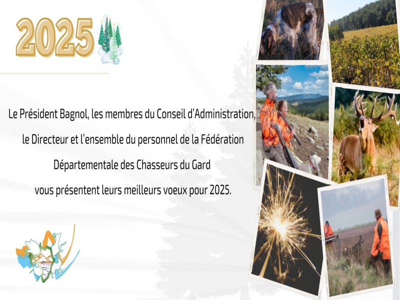 Le Président Gilbert BAGNOL et les membres du Conseil d'Administration, le Directeur Marc VALAT et l'ensemble du personnel de la Fédération Départementale des Chasseurs du Gard vous présentent leurs meilleurs voeux ...