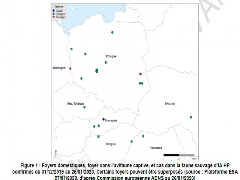 Depuis le 31 décembre 2019, 7 pays à l’est de la France ont été contaminés en Influenza aviaire (hautement pathogène). Le cas le plus proche est à moins de 700 km de notre frontière (cf infra).