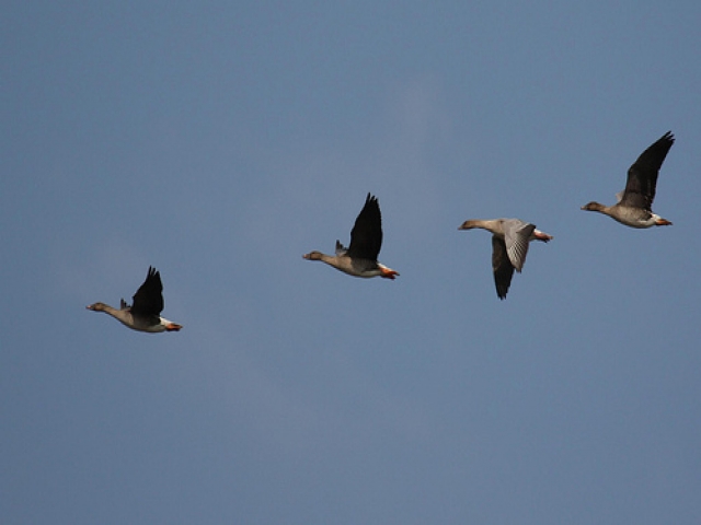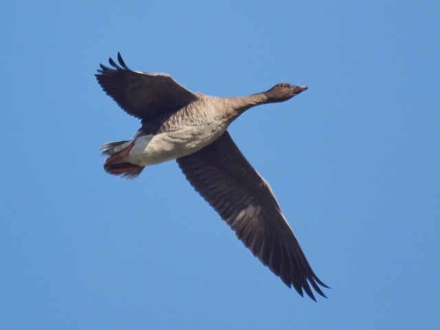 En vol, cette oie paraît très sombre, plus que les autres espèces d’oies « grises ».
