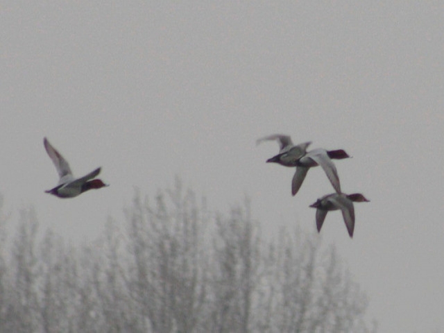 En vol, la silhouette des Fuligules milouins paraît ramassée, les ailes grises sont éclaircies par une bande pâle. Les milouins forment des groupes compacts et homogènes.